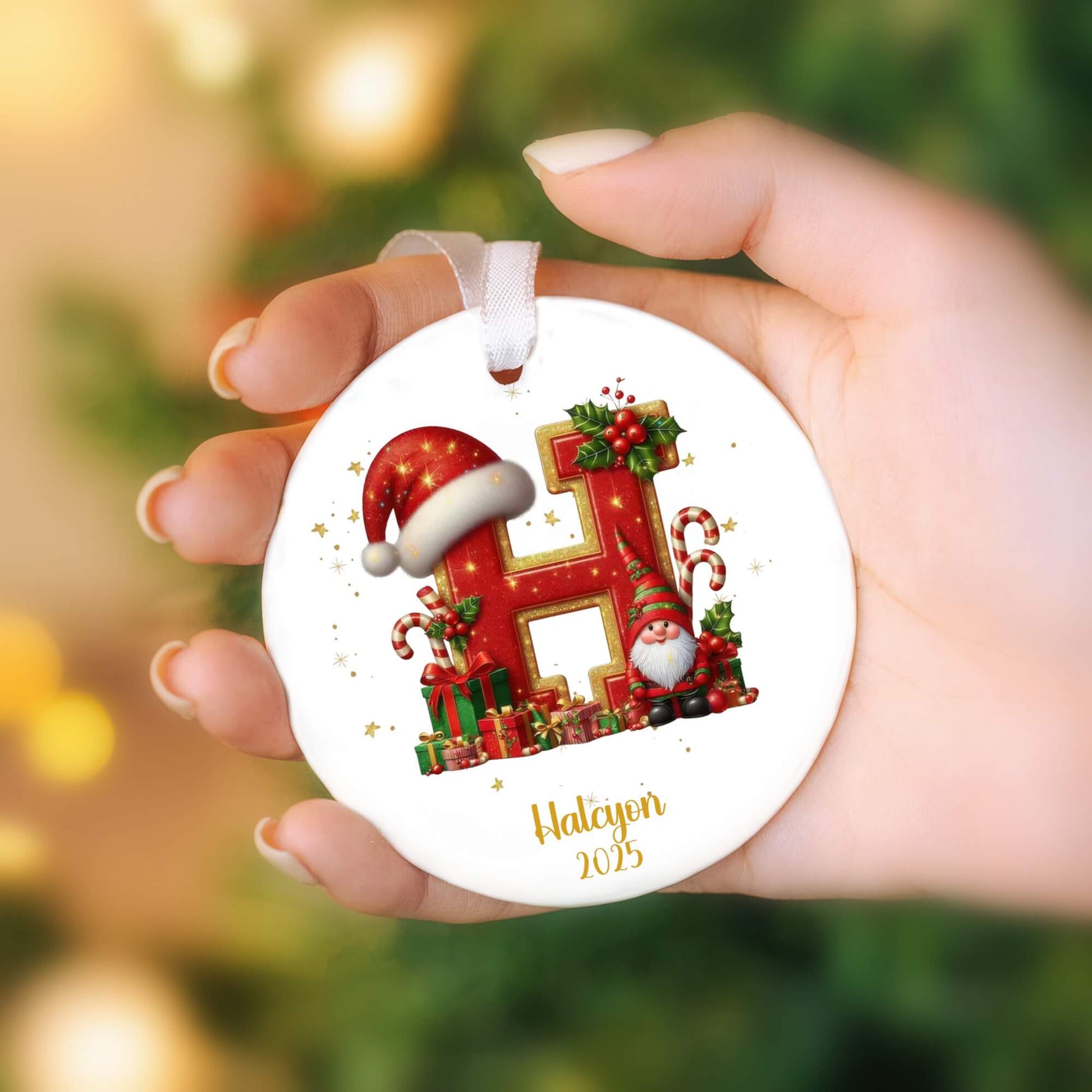 This custom ceramic ornament adds a personal touch to your holiday decor. Designed for families and individuals who love personalized keepsakes, it features a white ceramic body with a glossy finish.